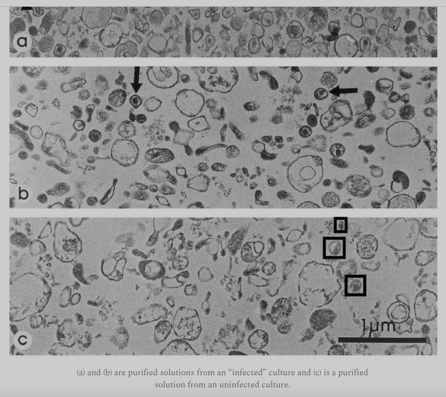 The electron micrographs from the Gluschankof experiment show no differences between the ‘infected’ and control micrographs, and as you can see, does not isolate anything, just as Charles Dauguet said “what we have seen all the time is cellular debris, no virus particles.” Montagnier and Gallo did NOT show any electron micrographs.